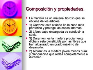 Este documento describe los principales componentes y propiedades de la madera, incluyendo la corteza, el líber y el duramen. Explica el proceso de obtención de la madera que involucra la tala, el aserrado y el secado. También describe diferentes tipos de tableros de madera como contrachapados, tableros aglomerados y madera prensada. Finalmente, resume las propiedades básicas del papel, incluyendo su resistencia, manipulación y uso como soporte de escritura.