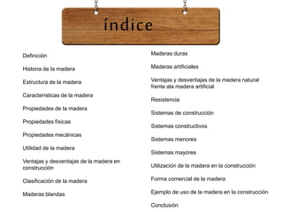 La madera es el tejido fibroso de los árboles, utilizado por el ser humano desde la antigüedad para diversas aplicaciones. Se clasifica en maderas blandas y duras, cada una con características propias que afectan su uso en la construcción y fabricación de muebles. Aunque la madera natural ofrece ventajas como ser renovable y buen aislante, también presenta desventajas frente a las maderas artificiales, como vulnerabilidad a plagas y variabilidad en calidad.