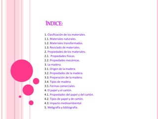 El documento trata sobre los diferentes tipos de materiales, incluyendo materiales naturales como la madera y materiales transformados como el papel y el cartón. Explica cómo se clasifican y describen las propiedades de los materiales, así como los procesos de obtención y usos comunes de materiales específicos como la madera, el papel y el cartón.