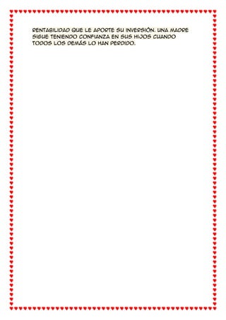 El documento habla sobre el amor incondicional de una madre. Resalta que una madre siempre está ahí para dar abrazos, escuchar, enseñar lecciones y dar fuerza y amor para guiar a sus hijos. Además, una madre da todo sin esperar nada a cambio y sigue creyendo en sus hijos incluso cuando otros ya no lo hacen.