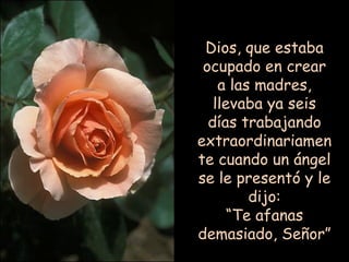 El documento narra un diálogo entre Dios y un ángel sobre la creación de la madre. Dios le explica al ángel las complejas especificaciones para la madre, incluyendo que debe ser lavable, tener 180 piezas móviles reemplazables, funcionar con café y sobras de comida, tener un regazo desaparecible y besos curativos, y tres pares de ojos. A pesar de las dudas del ángel, Dios insiste en que la madre es muy resistente y capaz de hacer y sobrellevar mucho. El ángel final