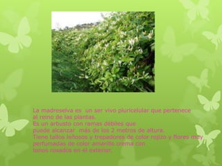 La madreselva es un arbusto trepador con tallos leñosos y flores amarillas perfumadas que puede alcanzar más de 2 metros de altura. Habita en el sur de Europa donde fabrica su propio alimento a través de la fotosíntesis y absorbiendo agua y sales minerales del suelo, y se reproduce mediante la polinización de insectos y el viento. Existen varios tipos de madreselva que se usan como planta ornamental en jardines y también para fabricar tratamientos para enfermedades respiratorias.