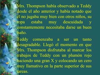 La maestra Mrs. Thompson inicialmente no prestaba atención a Teddy, un estudiante con una situación familiar difícil. Sin embargo, al revisar su historial académico, se dio cuenta de los desafíos por los que había pasado Teddy y comenzó a apoyarlo especialmente. Gracias a esto, los resultados de Teddy mejoraron significativamente y desarrolló un fuerte vínculo con Mrs. Thompson, manteniendo el contacto con ella a lo largo de su vida e indicándole que ella había sido la maestra más importante.