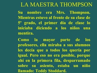 La maestra Thompson inicialmente no le prestaba atención a Teddy, un estudiante con problemas familiares. Sin embargo, al revisar su expediente y darse cuenta de su situación, comenzó a brindarle más apoyo. Para el final del año escolar, Teddy se había convertido en uno de los mejores estudiantes gracias al apoyo de la maestra Thompson. Años después, Teddy se graduó con honores y se convirtió en doctor, atribuyendo su éxito a la maestra Thompson por haber creído en él.