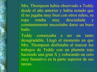 La maestra Mrs. Thompson inicialmente no prestaba atención a Teddy, un estudiante con problemas familiares, pero al revisar su historial escolar y darse cuenta de su situación, comenzó a apoyarlo especialmente. Los esfuerzos de Mrs. Thompson ayudaron a Teddy a progresar académicamente y convertirse en uno de los mejores estudiantes. Años después, Teddy se había convertido en un médico exitoso y le atribuyó su éxito a la creencia y apoyo que recibió de su maestra.