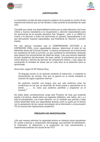 Este documento describe un proyecto para estimular la capacidad lectora en los estudiantes de una escuela rural utilizando las TIC. El proyecto utilizará videos, lecturas, presentaciones y software educativo para desarrollar habilidades de lectura y escritura a través de actividades como la elaboración de poesías y cuentos. El proceso se evaluará observando la comprensión y producción de textos de los estudiantes.