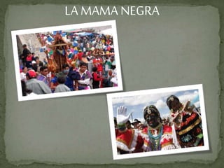 La Mama Negra es una celebración folclórica que se realiza en Latacunga, Ecuador, en honor a la Virgen de la Merced. Tiene sus orígenes en las representaciones de los habitantes locales de acontecimientos y personajes asociados con sus festividades religiosas después de la llegada de esclavos africanos en el siglo XVIII. La celebración actual se lleva a cabo los días 23 y 24 de septiembre y honra a la Virgen de la Merced por su protección durante la erupción del volcán Cotopaxi en 174