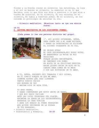Este documento presenta una guía para una oración silenciosa en grupo. Incluye lecturas bíblicas, poemas y reflexiones sobre el poder del silencio para escuchar a Dios. El evangelio habla sobre no agobiarse por las preocupaciones materiales y buscar primero el reino de Dios. La oración concluye con la bendición eucarística y cánticos a María y al Santísimo Sacramento.