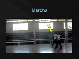 Este documento presenta la historia, reglamento y progresiones de enseñanza de la marcha atlética. Explica que el objetivo general es mostrar estas temáticas de la marcha atlética a través de gráficos claros y explicaciones sencillas. También detalla algunas reglas como no tomar el avituallamiento de otro competidor, lo cual puede resultar en una tarjeta roja y posible descalificación. Además, cubre detalles sobre el abastecimiento de agua y refrescos en distintas competiciones.