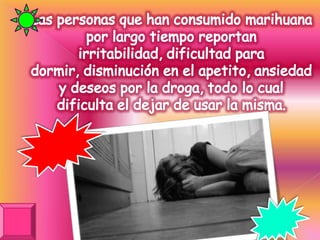 La marihuana es la droga ilícita más comúnmente usada en los Estados Unidos. Se fuma para que el THC pase al torrente sanguíneo y al cerebro, actuando en receptores de canabinoides y causando euforia. El consumo a largo plazo puede llevar a adicción y tiene efectos dañinos en la salud como aumento de la frecuencia cardíaca, problemas respiratorios e incluso cáncer de pulmón.