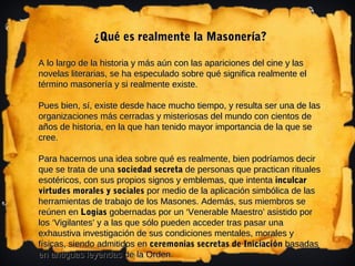 La masonería es una antigua sociedad secreta cuyos orígenes se remontan a los albañiles de la Edad Media. Aunque ha sido objeto de especulaciones, la masonería moderna surgió formalmente en el siglo XVIII en Inglaterra y se extendió por Europa y América. Está organizada en logias gobernadas por un Venerable Maestro y admite nuevos miembros a través de rituales de iniciación.