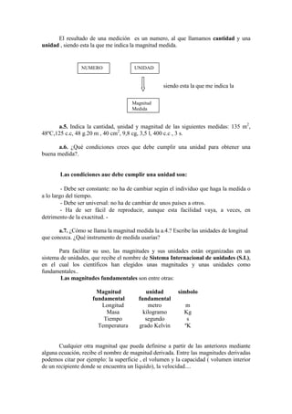 Este documento trata sobre las propiedades generales de la materia y la medida. Explica que la materia es todo lo que tiene masa y volumen, y que la masa y el volumen son propiedades generales de la materia. También define la medición como la comparación de una magnitud con una unidad de medida estándar, y que el resultado de una medición es un número y una unidad. Finalmente, introduce el Sistema Internacional de Unidades.
