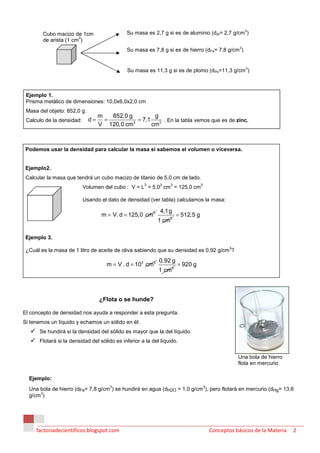 El documento describe las propiedades fundamentales de la materia, incluyendo masa, volumen y densidad. Explica que la densidad es una propiedad característica que puede usarse para identificar sustancias y clasificarlas como más o menos ligeras. También describe los tres estados de agregación de la materia - sólido, líquido y gas - y los cambios de estado entre ellos.