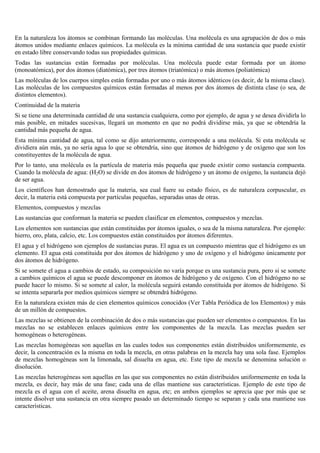 La materia está compuesta de átomos que se unen para formar moléculas. Existen tres estados de la materia: sólido, líquido y gas. La materia puede presentarse como elementos, compuestos o mezclas. Los elementos contienen un solo tipo de átomo, los compuestos contienen más de un tipo de átomo, y las mezclas son sustancias que no forman enlaces químicos.