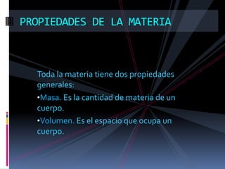 Este documento resume las propiedades y los cambios de la materia. Explica que la materia tiene masa y volumen, y propiedades como densidad, dureza y capacidad para dejar pasar la luz. La materia puede estar en estado sólido, líquido o gaseoso. Experimenta cambios físicos como variaciones de temperatura o volumen, y cambios químicos como oxidación o combustión. También describe las sustancias puras, las mezclas homogéneas e heterogéneas, y métodos para separar mezclas como filtración