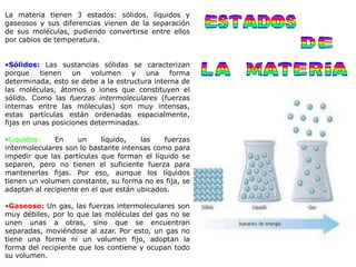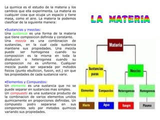 La química estudia la materia y sus cambios. La materia puede ser sustancias u mezclas. Las sustancias tienen composición definida mientras que las mezclas mantienen las propiedades de sus componentes. La materia también puede ser elementos o compuestos. Los elementos no pueden descomponerse más, mientras que los compuestos sólo pueden separarse en sus componentes mediante métodos químicos. La materia puede encontrarse en tres estados: sólido, líquido o gaseoso. Los cambios de estado incluyen la fusión, vaporización y sub