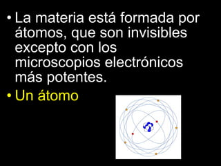 La materia estáformada por átomos, que son invisibles excepto con los microscopios electrónicos más potentes. Un átomo