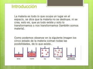 Este documento describe los cinco estados físicos de la materia: sólido, líquido, gaseoso, plasma y condensado de Bose-Einstein. Explica las características de cada estado, incluyendo la forma, volumen y comportamiento de las partículas. También proporciona ejemplos como la transformación del agua de líquido a sólido y sitios web de consulta sobre los diferentes estados de la materia.