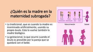 La maternidad subrogada implica que una mujer lleva adelante un embarazo para otra persona o pareja que desea tener un hijo pero no puede gestarlo. Existen dos tipos: la tradicional, donde la madre subrogada usa su propio óvulo, y la gestacional, donde el óvulo proviene de la pareja que se quedará con el bebé. En México, la maternidad subrogada es legal en los estados de Tabasco y Sinaloa, aunque su práctica plantea problemas personales, biomédicos, psicológic