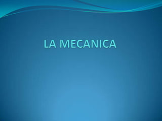 La mecánica es una ciencia perteneciente a la física que estudia los fenómenos físicos relacionados con el movimiento y las fuerzas. Incluye la mecánica relativista, que describe cómo la fuerza y la aceleración no son paralelas en trayectorias curvas, y la mecánica estadística, que usa métodos estadísticos para estudiar sistemas con muchas partículas. También comprende la mecánica de medios continuos, que analiza cuerpos deformables como sólidos y fluidos.