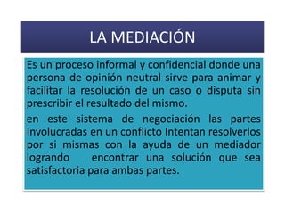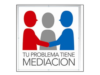 La mediación es un proceso informal y confidencial donde una persona neutral ayuda a las partes involucradas en un conflicto a resolverlo por sí mismas buscando una solución satisfactoria para ambas partes. El mediador es un profesional capacitado que facilita la comunicación entre las partes pero no juzga ni decide el resultado. El proceso de mediación incluye etapas preparatoria, de sesión y de acuerdos. Existen diferentes tipos de mediación como la familiar, laboral, escolar y comunitaria.