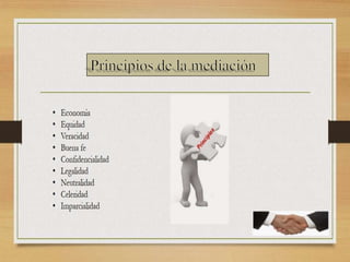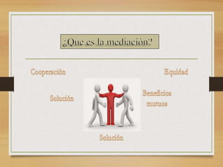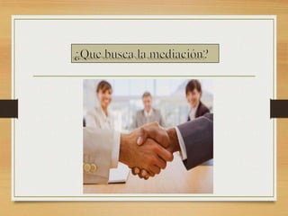 La mediación es un proceso voluntario en el que dos partes en conflicto acuden a un mediador imparcial para resolver el problema y generar sus propias decisiones de forma flexible y participativa. El mediador crea un espacio para que las partes lleguen a un consenso de forma rápida, pacífica y justa. La mediación contribuye al descongestionamiento del sistema de justicia al resolver controversias con celeridad y menores costos que un juicio.