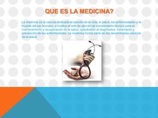 La medicina es la ciencia dedicada al estudio de la vida, la salud y las enfermedades del ser humano. Tiene sus orígenes en la prehistoria y se ha desarrollado en diferentes culturas a lo largo de la historia. El báculo de Asclepio o Esculapio es el símbolo universal de la medicina. La práctica de la medicina combina la ciencia y el arte aplicados a través de la relación entre el médico y el paciente para diagnosticar, tratar y prevenir enfermedades.