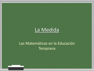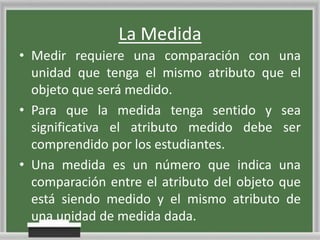 Este documento describe los conceptos básicos de medida que se enseñan en la educación temprana, incluyendo longitud, capacidad, volumen, peso y tiempo. Explica que la medida requiere comparar un atributo de un objeto con una unidad de medida y que es importante que los estudiantes estimen antes de medir para concentrarse en el atributo y familiarizarse con las unidades. También lista algunas unidades de medida informales y estandarizadas para cada concepto.