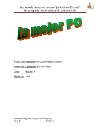 Este documento describe las especificaciones técnicas recomendadas para tres tipos de computadoras según el perfil de usuario: diseñador gráfico, oficinista y profesor de tecnología. Para el diseñador gráfico, recomienda un potente procesador Intel i7 con 6 núcleos, memoria RAM de alta velocidad y capacidad, y una tarjeta de video profesional con refrigeración líquida para ejecutar software de diseño y renderizado.