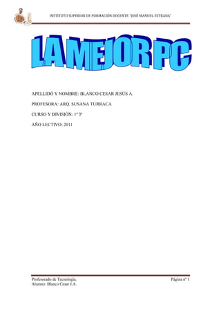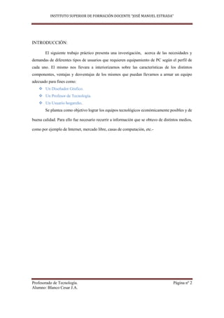 El documento describe tres configuraciones de PC propuestas para diferentes usuarios: un profesor de tecnología, un usuario hogareño y un diseñador gráfico. Cada configuración incluye los componentes de hardware recomendados como el procesador, placa base, memoria RAM, unidad de almacenamiento y accesorios. El objetivo es armar equipos de buena calidad y rendimiento a precios económicos según el perfil y necesidades de cada usuario.
