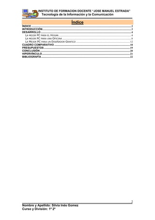 El documento describe las especificaciones técnicas de tres computadoras diferentes diseñadas para diferentes usos: una PC para el hogar, una para una oficina, y una para un diseñador gráfico. Detalla los componentes de cada PC como el procesador, memoria, placa madre, disco duro, unidad óptica, monitor y sistema operativo.