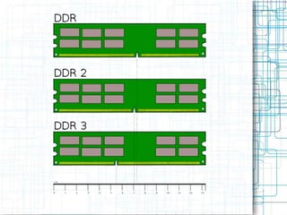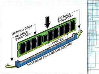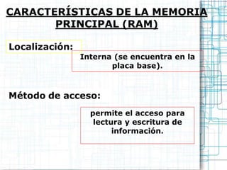La memoria RAM se utiliza para almacenar instrucciones y datos temporales del procesador. Está compuesta por chips conectados a la placa base y los datos se borran cuando se desconecta la electricidad. A lo largo de los años se han desarrollado diferentes tipos de módulos RAM como SIMM, DIMM, SDRAM, DDR, DDR2 y DDR3 con mayores velocidades de acceso y ancho de banda. Los precios de los módulos RAM han ido bajando con el tiempo gracias a las mejoras tecnológicas.