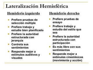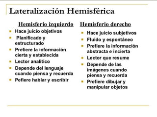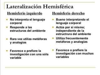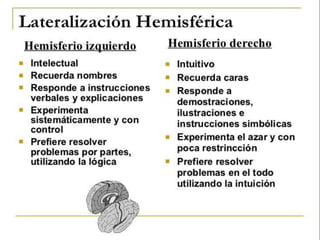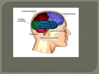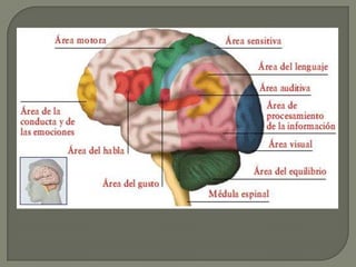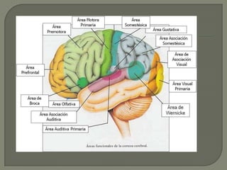 Este documento describe las principales áreas del cerebro y sus funciones. El lóbulo frontal se encarga del lenguaje y las funciones cognitivas. El lóbulo parietal procesa la sensibilidad y percepción. El lóbulo temporal participa en la memoria y emociones. El lóbulo occipital contiene las áreas visuales. Cada hemisferio controla el lado opuesto del cuerpo a través de conexiones nerviosas.