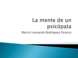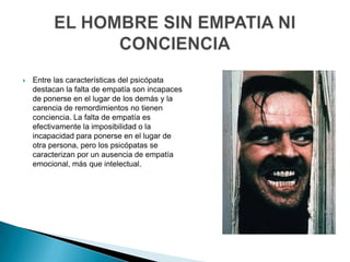 El documento describe las características de los psicópatas, incluyendo su falta de empatía y remordimientos. Los psicópatas no pueden sentir o manejar sus propias emociones y son incapaces de establecer vínculos afectivos. Su comportamiento afecta a cientos o miles de personas y tienen un gran impacto en la sociedad. Las partes del cerebro de un psicópata que se activan al analizar estímulos emocionales son diferentes a las de la mayoría de las personas.