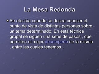 La Mesa Redonda es una técnica grupal para discutir un tema desde diferentes puntos de vista. Requiere preparación previa para coordinar el desarrollo y establecer el orden de las exposiciones. Durante la Mesa Redonda, el coordinador presenta el tema y los expositores, luego cada expositor habla por un tiempo estipulado para expresar su punto de vista. Finalmente, el público puede hacer preguntas.