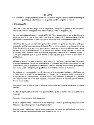 Este documento resume el libro "La Meta" de Eliyahu M. Goldratt. El libro cuenta la historia de Alex Rogo, gerente de una planta manufacturera con problemas de eficiencia. Siguiendo los consejos de su profesor Jhona, Alex identifica los cuellos de botella en la producción y toma medidas para mejorar el flujo a través de la planta, aumentando así los ingresos. El libro propone cinco pasos para la mejora continua enfocada en explotar las limitaciones del sistema.