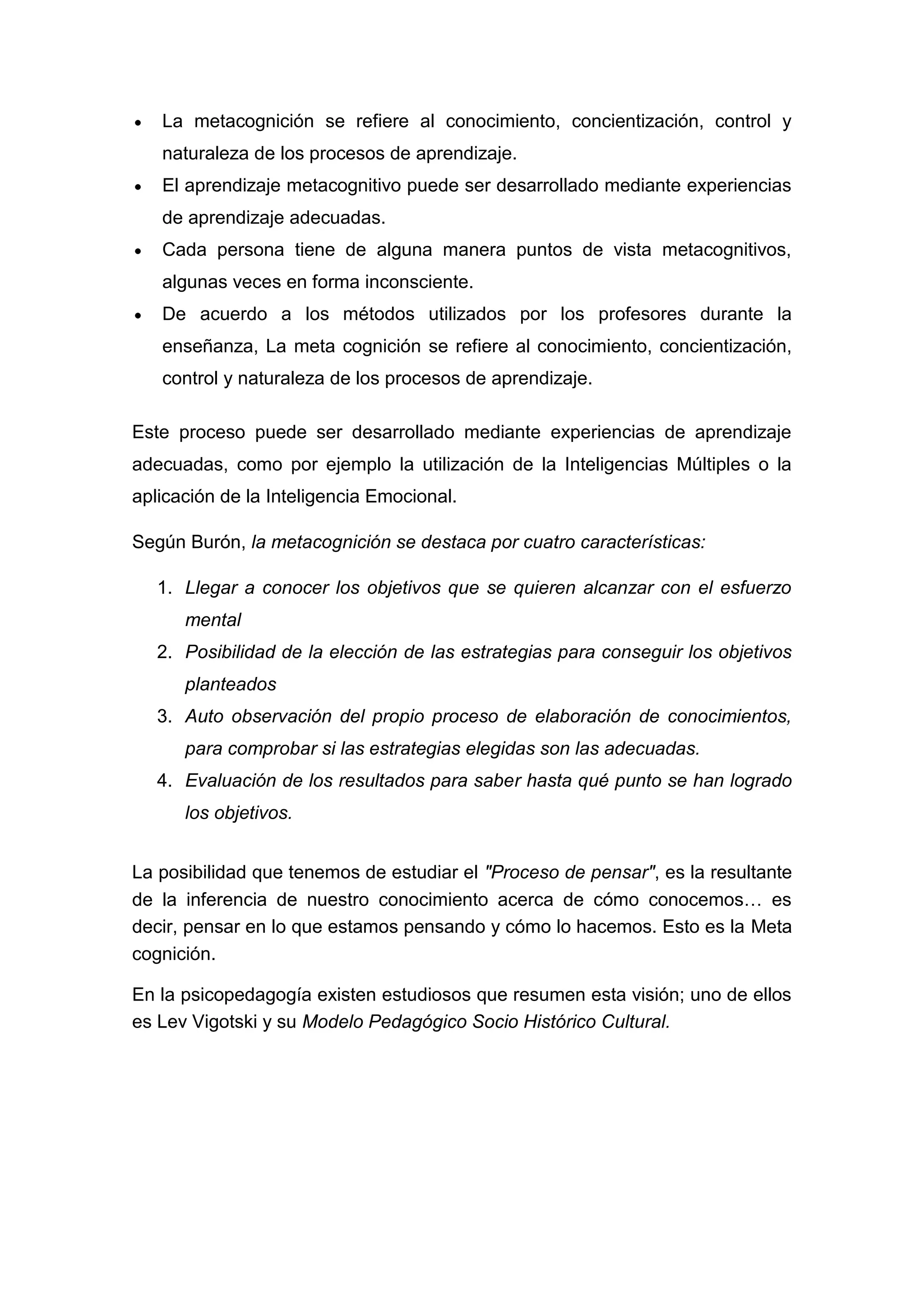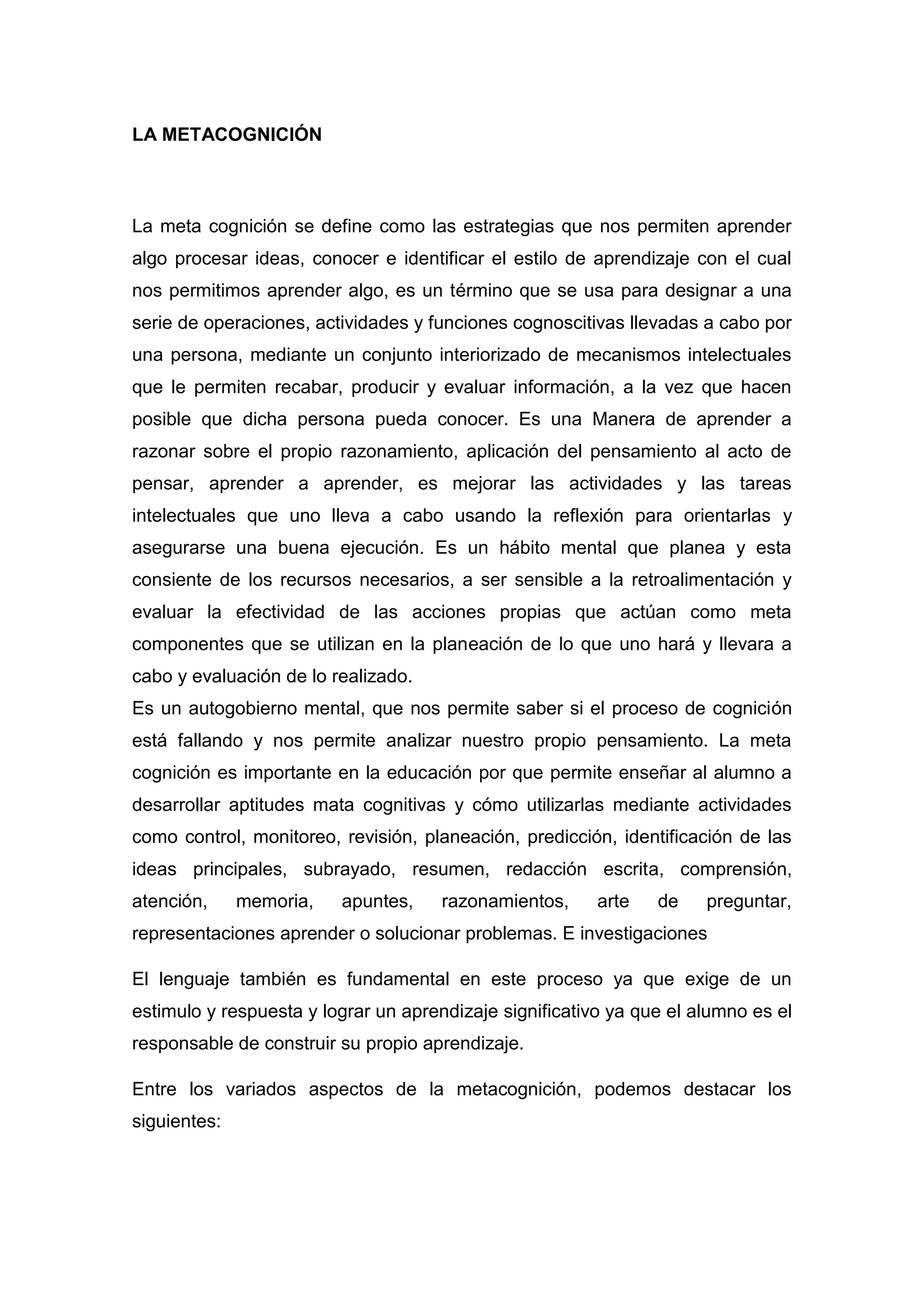 La metacognición se refiere al conocimiento y control de los procesos de aprendizaje propios. Incluye la capacidad de planificar, monitorear y evaluar el propio pensamiento y aprendizaje. Es importante en la educación porque permite enseñar al alumno a desarrollar habilidades como la comprensión, la atención y la resolución de problemas. La metacognición también implica reflexionar sobre el propio razonamiento y aprender a aprender de manera autónoma.
