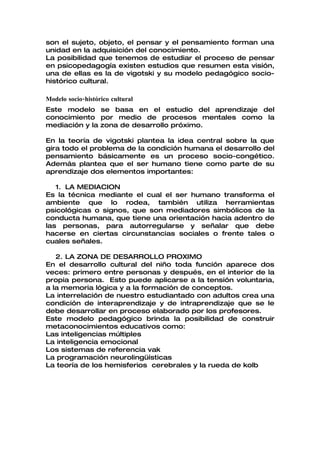 La metacognición se refiere al conocimiento de los propios procesos cognitivos y de aprendizaje. Implica planificar estrategias de aprendizaje, monitorear el progreso y evaluar los resultados. Según Flavell, la metacognición incluye conocer las propiedades de la información y los datos, así como las estrategias para procesarlos. Buron señala que la metacognición se distingue por conocer los objetivos del esfuerzo mental, elegir estrategias, comprobar su adecuación y evaluar los