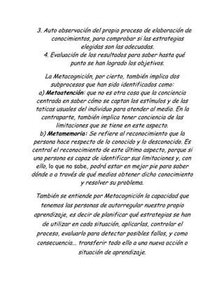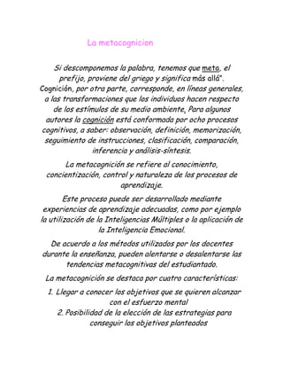 La metacognicion<br />Si descomponemos la palabra, tenemos que meta, el prefijo, proviene del griego y significa más allá”.Cognición, por otra parte, corresponde, en líneas generales, a las transformaciones que los individuos hacen respecto de los estímulos de su medio ambiente. Para algunos autores la cognición está conformada por ocho procesos cognitivos, a saber: observación, definición, memorización, seguimiento de instrucciones, clasificación, comparación, inferencia y análisis-síntesis.<br />La metacognición se refiere al conocimiento, concientización, control y naturaleza de los procesos de aprendizaje.<br />Este proceso puede ser desarrollado mediante experiencias de aprendizaje adecuadas, como por ejemplo la utilización de la Inteligencias Múltiples o la aplicación de la Inteligencia Emocional.<br />De acuerdo a los métodos utilizados por los docentes durante la enseñanza, pueden alentarse o desalentarse las tendencias metacognitivas del estudiantado.<br />La metacognición se destaca por cuatro características:<br />Llegar a conocer los objetivos que se quieren alcanzar con el esfuerzo mental<br />Posibilidad de la elección de las estrategias para conseguir los objetivos planteados<br />Auto observación del propio proceso de elaboración de conocimientos, para comprobar si las estrategias elegidas son las adecuadas.<br />Evaluación de los resultados para saber hasta qué punto se han logrado los objetivos.<br />La Metacognición, por cierto, también implica dos subprocesos que han sido identificados como:a) Metaatención: que no es otra cosa que la conciencia centrada en saber cómo se captan los estímulos y de las taticas usuales del individuo para atender al medio. En la contraparte, también implica tener conciencia de las limitaciones que se tiene en este aspecto.b) Metamemoria: Se refiere al reconocimiento que la persona hace respecto de lo conocido y lo desconocido. Es central el reconocimiento de este último aspecto, porque si una persona es capaz de identificar sus limitaciones y, con ello, lo que no sabe, podrá estar en mejor pie para saber dónde o a través de qué medios obtener dicho conocimiento y resolver su problema.<br />También se entiende por Metacognición la capacidad que tenemos las personas de autorregular nuestro propio aprendizaje, es decir de planificar qué estrategias se han de utilizar en cada situación, aplicarlas, controlar el proceso, evaluarlo para detectar posibles fallos, y como consecuencia... transferir todo ello a una nueva acción o situación de aprendizaje.<br />