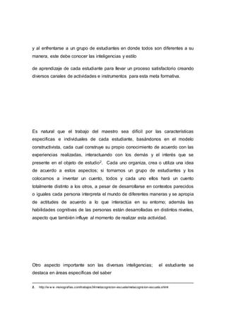 La metacognición es un proceso importante para mejorar el aprendizaje de los estudiantes. Implica que los estudiantes reconozcan sus propias habilidades, estilos de aprendizaje y debilidades para poder crear planes que mejoren su aprendizaje. También requiere que los maestros conozcan las características individuales de cada estudiante para guiarlos en este proceso y utilizar diversas estrategias y actividades que se ajusten a cada uno. La metacognición incluye cuatro pasos claves: establecer objetivos, eleg