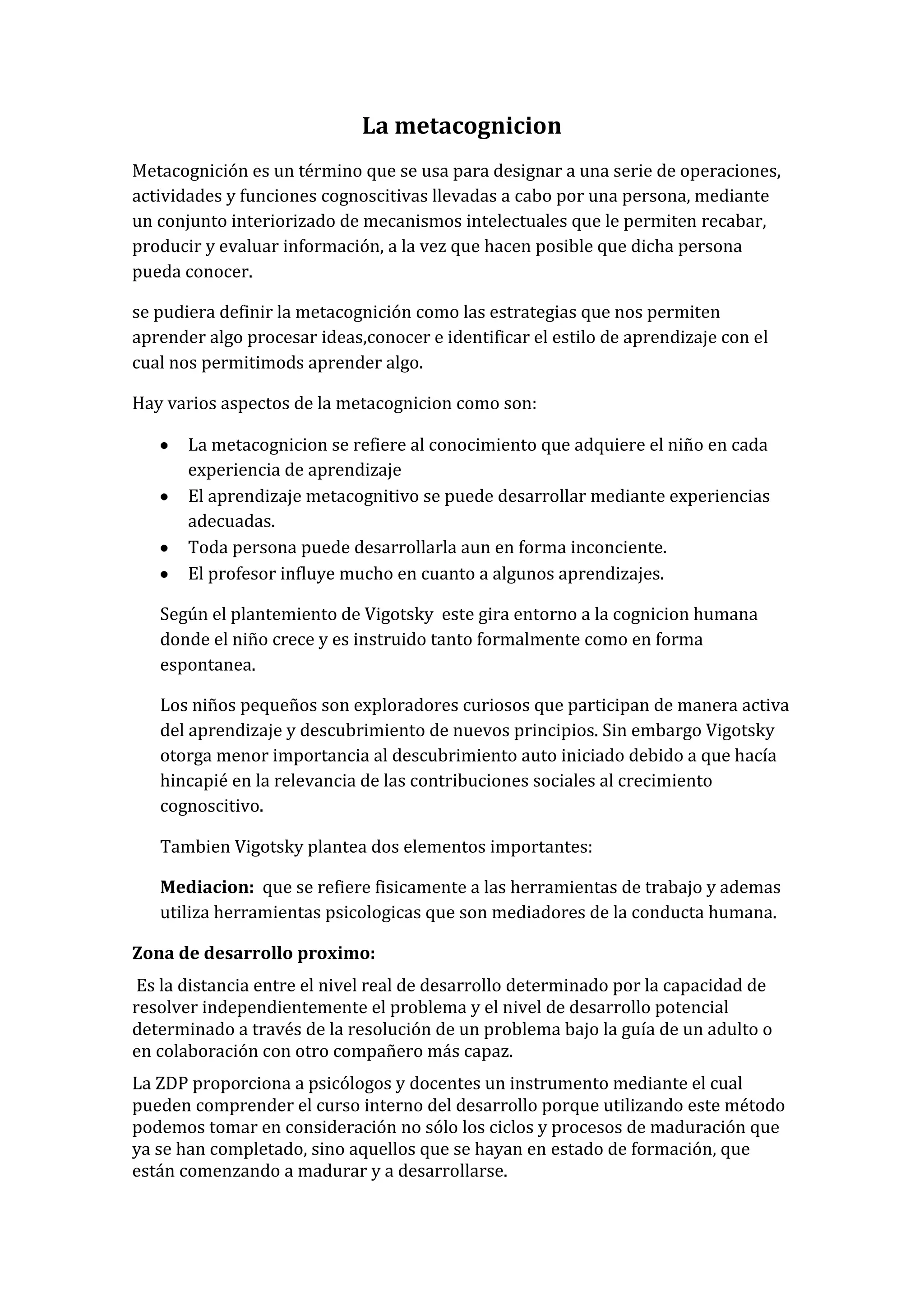 La metacognición se refiere a las estrategias que nos permiten aprender, procesar ideas y conocer nuestro estilo de aprendizaje. Incluye el conocimiento que adquiere un niño con cada experiencia de aprendizaje y puede desarrollarse a través de experiencias adecuadas. Según Vigotsky, el aprendizaje se ve influenciado por factores sociales y ocurre en la "zona de desarrollo próximo" donde los niños pueden lograr más cuando se les guía por alguien más capaz. Howard Gardner propone que las personas