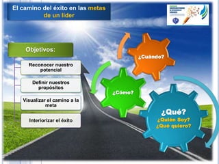 El documento presenta las etapas para alcanzar el éxito en las metas de un líder, incluyendo reconocer el potencial propio, definir los propósitos y visualizar el camino hacia la meta. Explica que es necesario descubrir el propósito de vida para tener una visión clara, y convertir los sueños en metas específicas con una actitud determinada. También identifica factores que pueden obstaculizar el éxito como ignorar la importancia de las metas, falta de método y temor al fracaso.