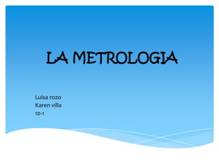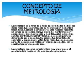 La metrología estudia las mediciones para garantizar su normalización y exactitud. Incluye el estudio y aplicación del sistema internacional de unidades. Tiene tres campos: legal, industrial y científico. Su objetivo es obtener valores de magnitudes con la precisión requerida usando instrumentos y métodos adecuados.