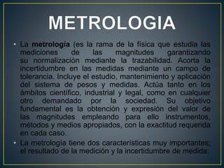La metrología estudia las mediciones y su normalización mediante la trazabilidad para reducir la incertidumbre. Incluye el estudio, mantenimiento y aplicación del sistema internacional de unidades, así como el desarrollo y uso de patrones y instrumentos de medición. La metrología permite comparar mediciones de forma internacional y garantizar la calidad e intercambiabilidad de productos.