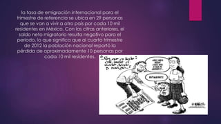 La tasa de emigración internacional en México es de 29 personas por cada 10 mil residentes, con un saldo neto migratorio negativo al cuarto trimestre de 2012, resultando en la pérdida de aproximadamente 10 personas por cada 10 mil. México se considera un país de origen, tránsito y destino de migrantes, con cerca de 40 mil niños repatriados de EE.UU. cada año, de los cuales 18,000 viajan solos. Además, el documento menciona la importancia de los derechos humanos y la protección infantil en el contexto migratorio.