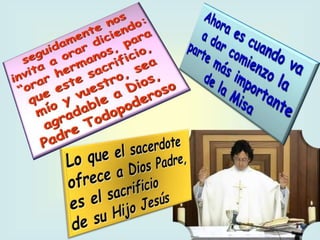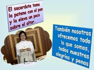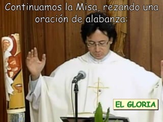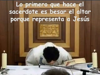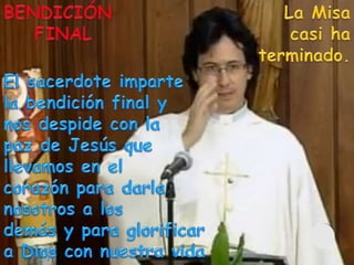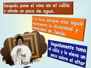 El documento describe la importancia del domingo para los cristianos, destacando su función como día de descanso y celebración de la eucaristía. Se explica que la misa es un encuentro personal con Jesús que invita a los fieles a reflexionar y poner en práctica las enseñanzas cristianas. Además, se detallan las diferentes partes de la misa, como la liturgia de la palabra y la eucarística, resaltando el sacrificio y el amor de Cristo por la humanidad.
