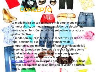 La moda se refiere a las tendencias de comportamiento y estilo que son adoptadas por un grupo de personas y que cambian con el tiempo. A lo largo de la historia, diferentes grupos han influenciado la moda, como la realeza en el pasado y las celebridades y anunciantes en la actualidad. La moda ha evolucionado desde el siglo XIV hasta nuestros días, impulsada por creadores de imagen que promueven nuevas tendencias.