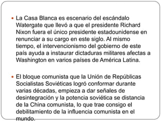 El documento resume los principales acontecimientos políticos, sociales y culturales de la década de 1970. Entre ellos se destacan el conflicto árabe-israelí, la guerra de Vietnam, la crisis del petróleo de 1973, el escándalo Watergate que llevó a la renuncia de Nixon, y el debilitamiento del bloque comunista. También menciona cambios políticos en varios países, el surgimiento del fundamentalismo islámico en Irán, y avances tecnológicos. En cuanto a la cultura y mod
