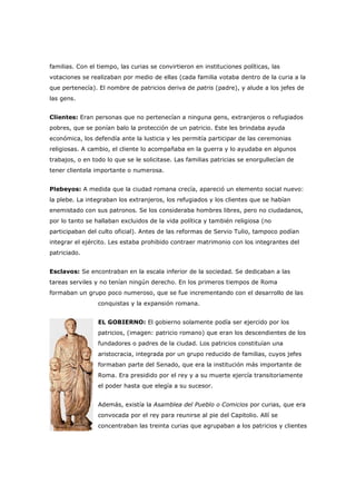 La sociedad romana monárquica estaba dividida en patricios, plebeyos y esclavos. Los patricios eran la aristocracia y tenían todos los derechos y privilegios, mientras que los plebeyos carecían de derechos y no podían participar en el gobierno. La economía se basaba principalmente en la agricultura. El gobierno estaba encabezado por un rey electo de por vida, quien gobernaba con la ayuda del Senado y la Asamblea del Pueblo. La religión romana era politeísta y adopt
