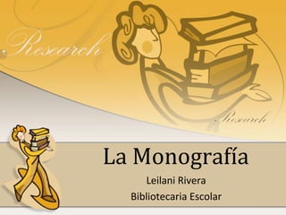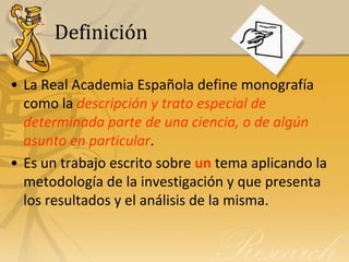 Este documento ofrece orientación sobre cómo elaborar una monografía. Define una monografía y explica los pasos clave que incluyen seleccionar un tema, consultar fuentes, tomar notas, preparar un bosquejo, redactar el documento y crear una lista de referencias. También cubre cómo limitar un tema amplio, tomar notas de manera organizada, evitar el plagio y el formato general de una monografía.